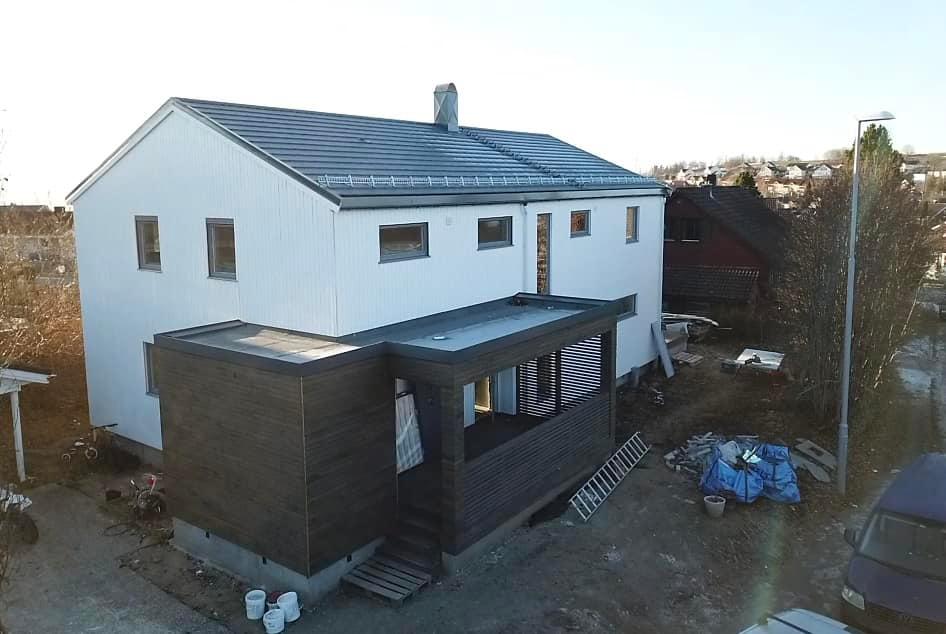 J&R Bygg tok på seg totalansvaret for prosjektet, som inkluderte alt fra utvidelse av boligen med et påbygg/tilbygg til betydelige forbedringer i bygningskonstruksjonen. Et av de mest fremtredende grepene var 33 cm høyere møne for å gi plass til ekstra isolasjon og dermed forbedre boligens energieffektivitet.