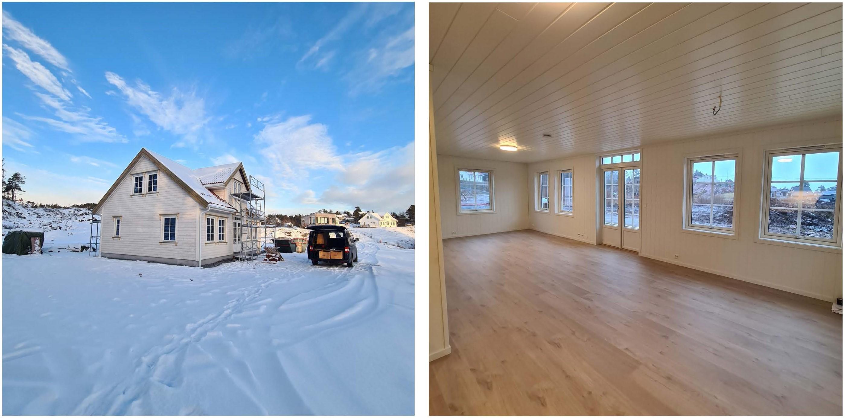 Et av våre mest omfattende prosjekter er transformasjonen av en eldre bolig fra 1975 til en moderne funkisbolig i Grimstad, i samarbeid med Wilson Eiendom AS. Huset ble totalrenovert i 2020, og vi gjennomførte en omfattende ombygging som inkluderte et ekstra tilbygg og en stilmessig fornyelse med rene linjer og store vindusflater.