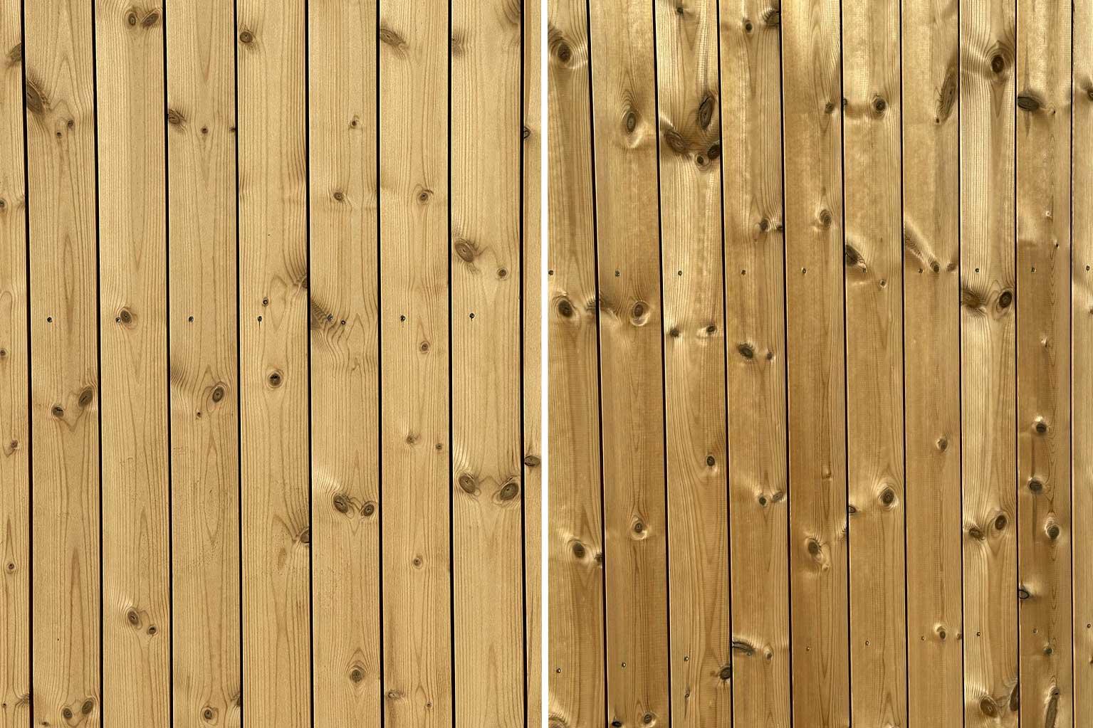 Her er vår Thermo furu kledning, den til venstre er finrillet og det til høyre er glatt høvlet.