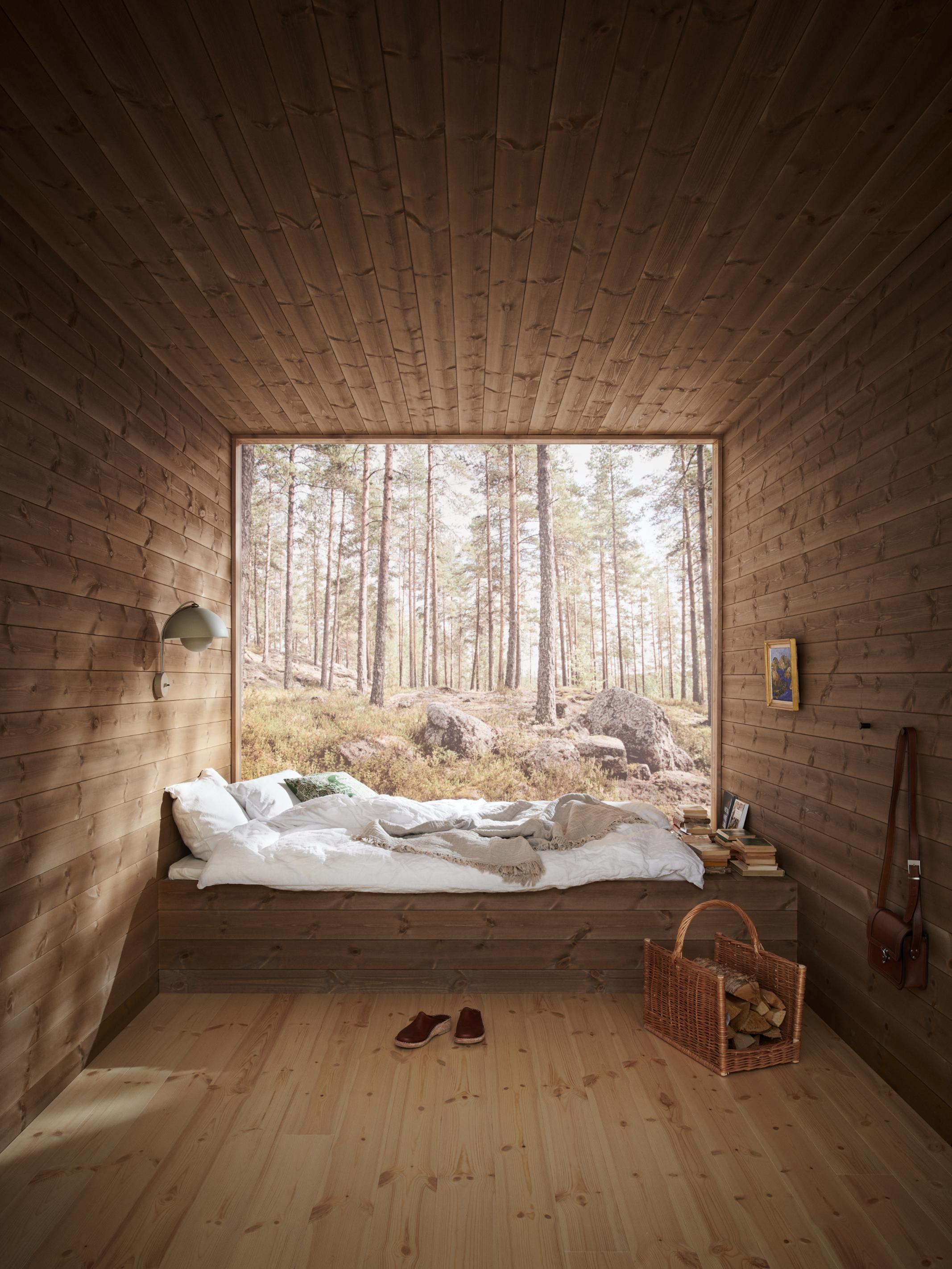 Listverk i samme farge som vegg og tak gir en lun følelse. Her er glattkantlist beiset i samme farge som panelet, Skogbrun. Foto: Lipkin/Moelven.