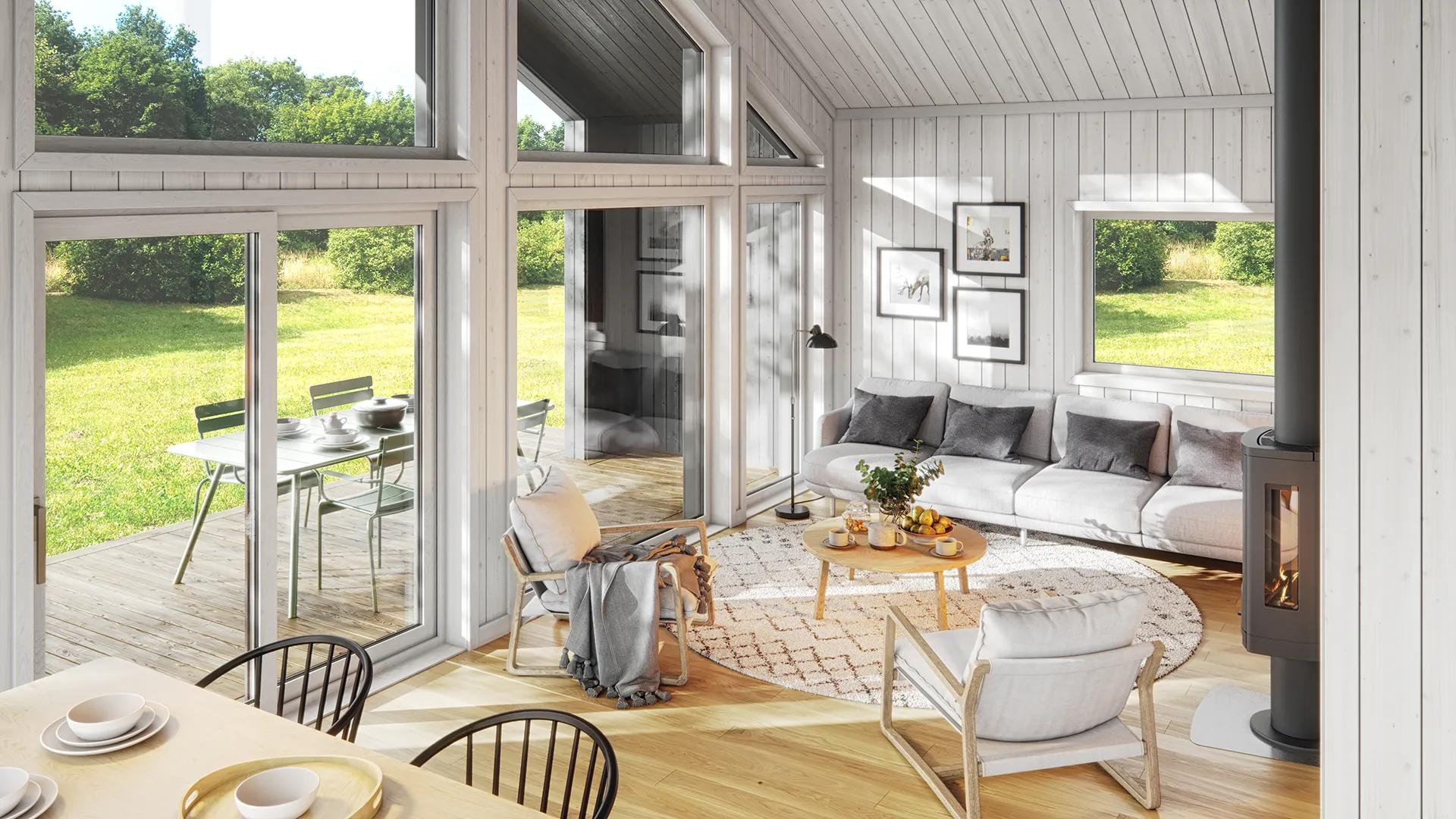 Ildstedet som er plassert i midten kan nytes fra hele denne hoveddelen av hytta. Hytta er prosjektert med tilgjengelighet i hovedplan.