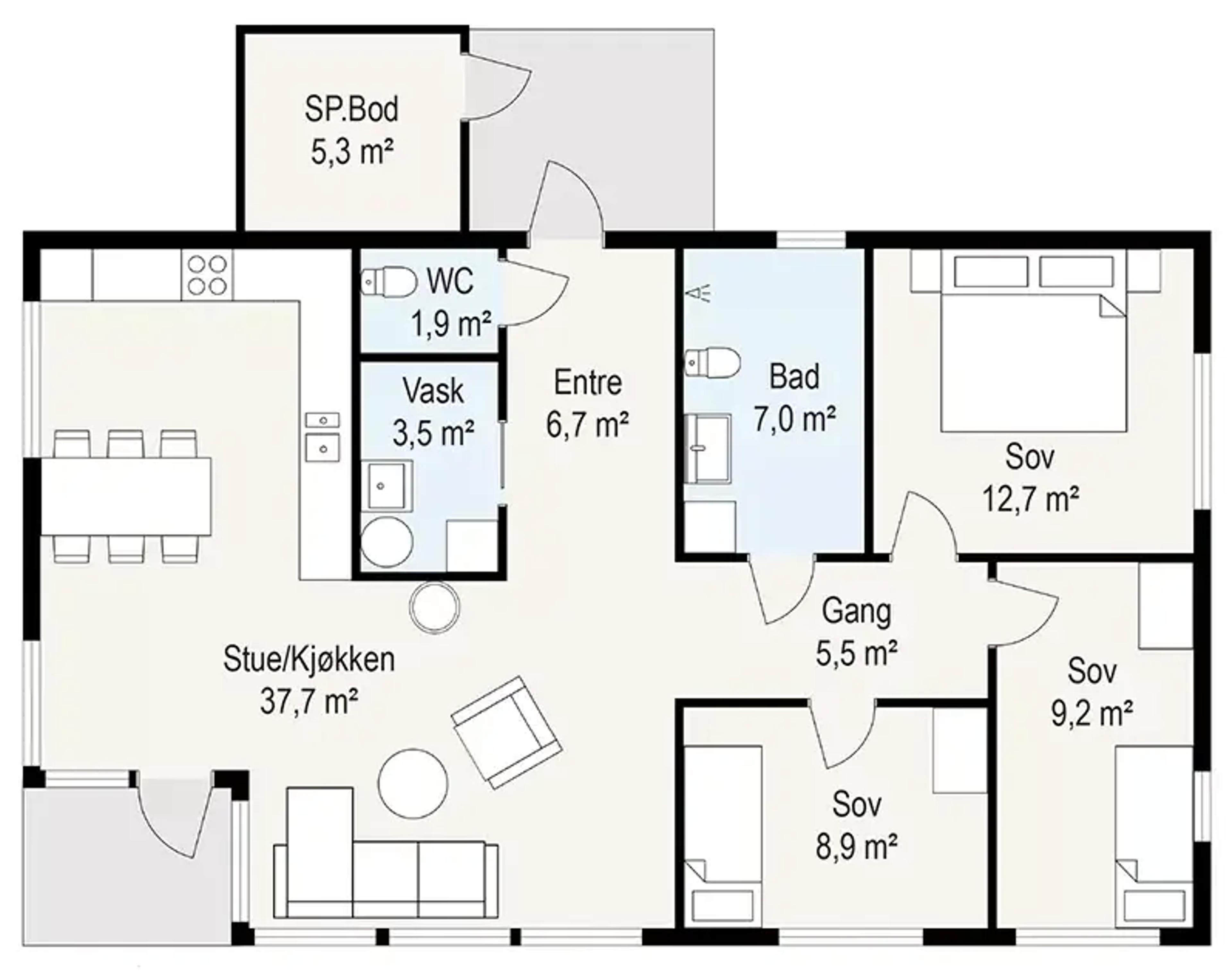 Boligen er tegnet med åpenhet og flyt mellom rommene, men det er mulig å sette inn dører mellom de ulike sonene om det skulle være ønskelig.