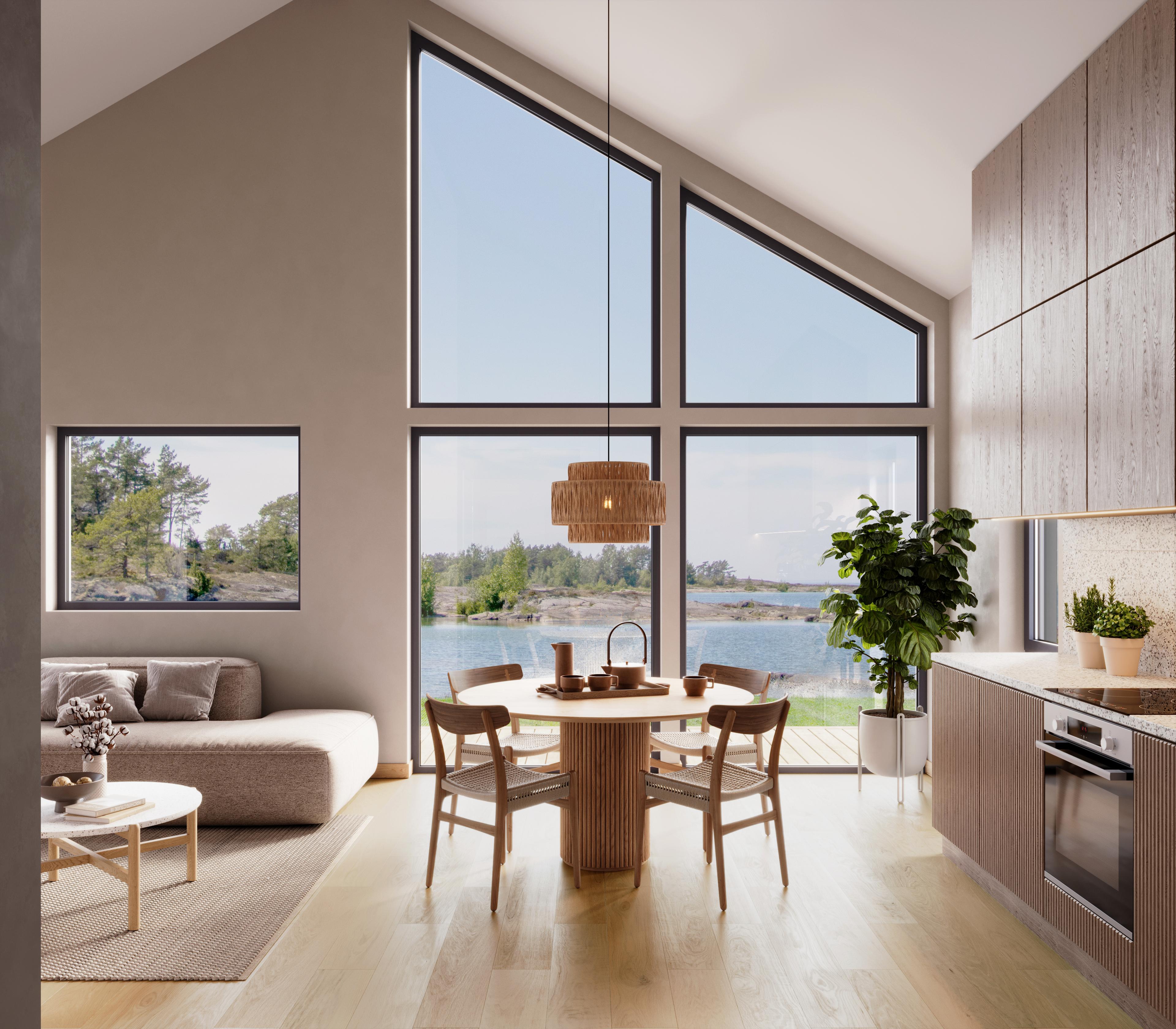 Selv om stuen ikke er så stor på papiret, gir den ekstra takhøyden og de store vinduene en imponerende romfølelse. Lys, luft og utsikt fyller oppholdsrommet og skaper en god atmosfære fra første steg inn døren.
