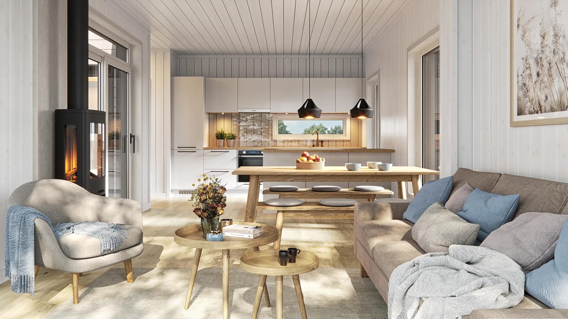 I oppholdsrommet er peisen plassert like ved sofasone og spisegruppe. Store vinduer i oppholdsrommet slipper naturen inn i hytta.