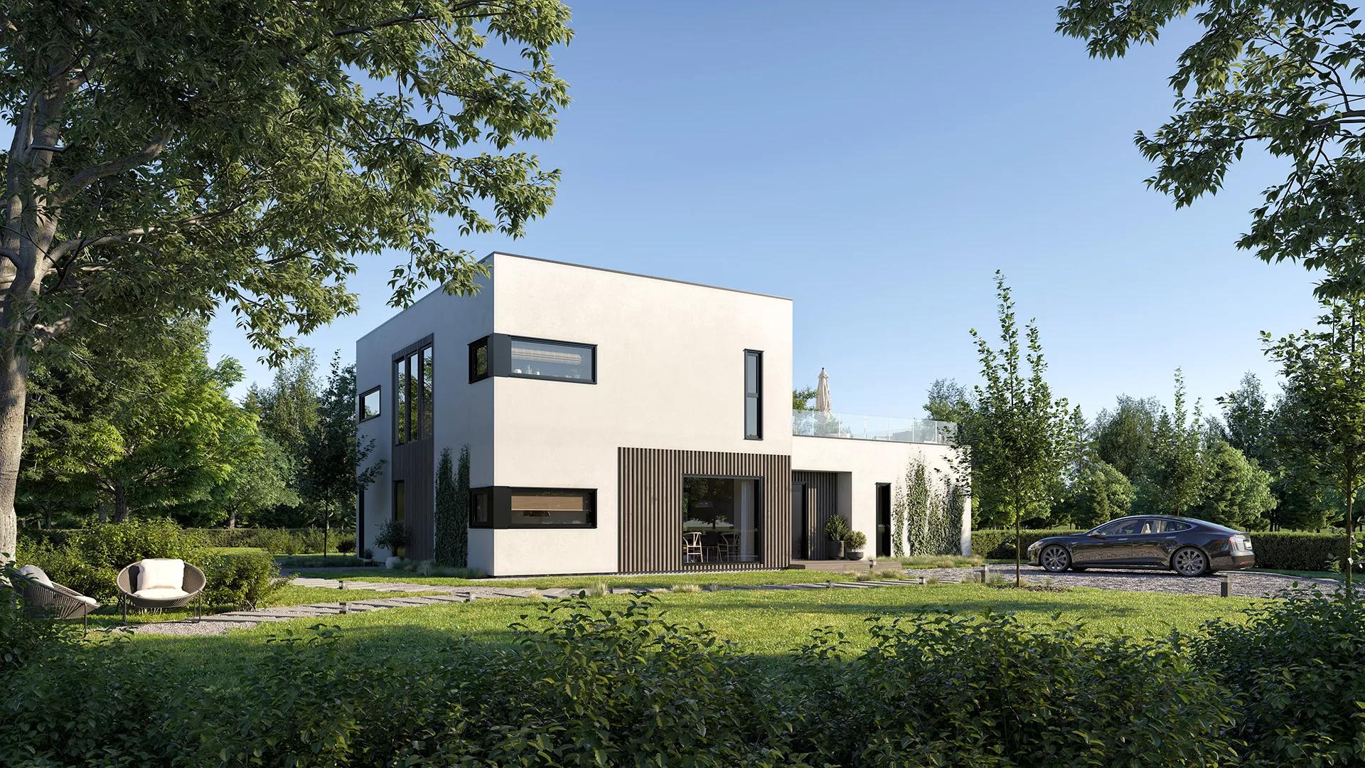 Man kan også velge å bygge boligen med en fasade av ren mur eller tre. Det er tilgang til hage og takterrasse fra flere soner i huset, noe som gir en god flyt mellom ute og inne, samt stor fleksibilitet i bruk av uteområdene. Den flotte takterrassen gir rom for privatliv for beboerne opp fra bakken. Stue og kjøkken er delt opp i to adskilte romslige sosiale soner som også kan skilles med skyvedør om man ønsker det.