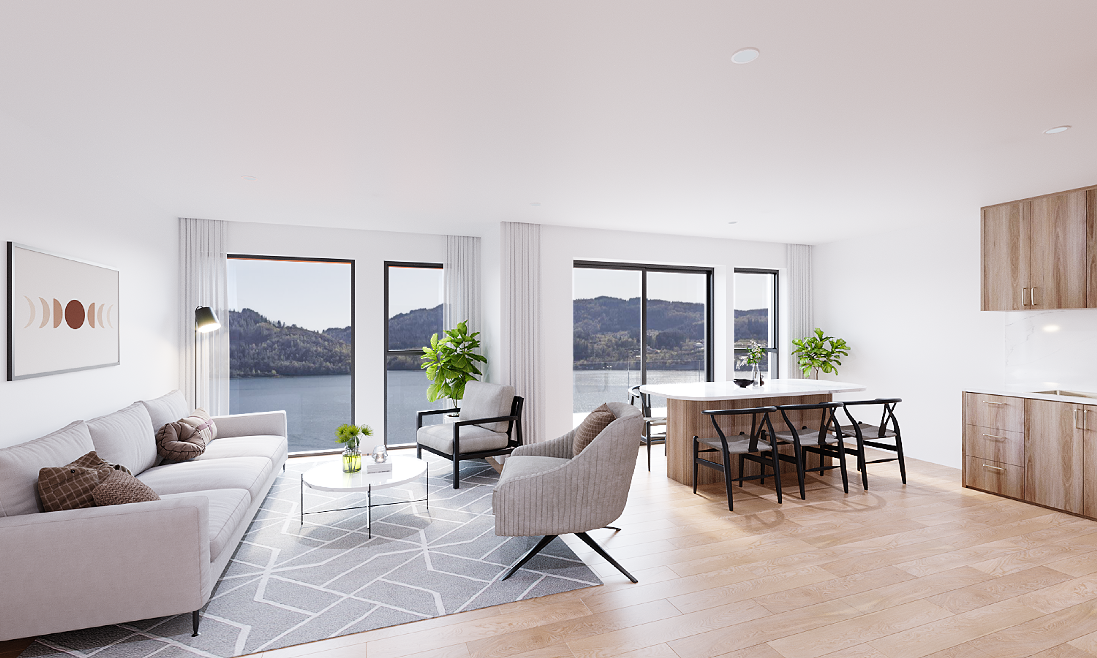 Boligene ligger vestvendt og solrikt til, og vender alle mot Kvernafjorden. Her ser du mot Flatøy og Gaustadfjellet. I tillegg til privat hage, blir det også et felles uteområde mot sjøen, med benker og fellesgriller som inviterer til et godt bomiljø.