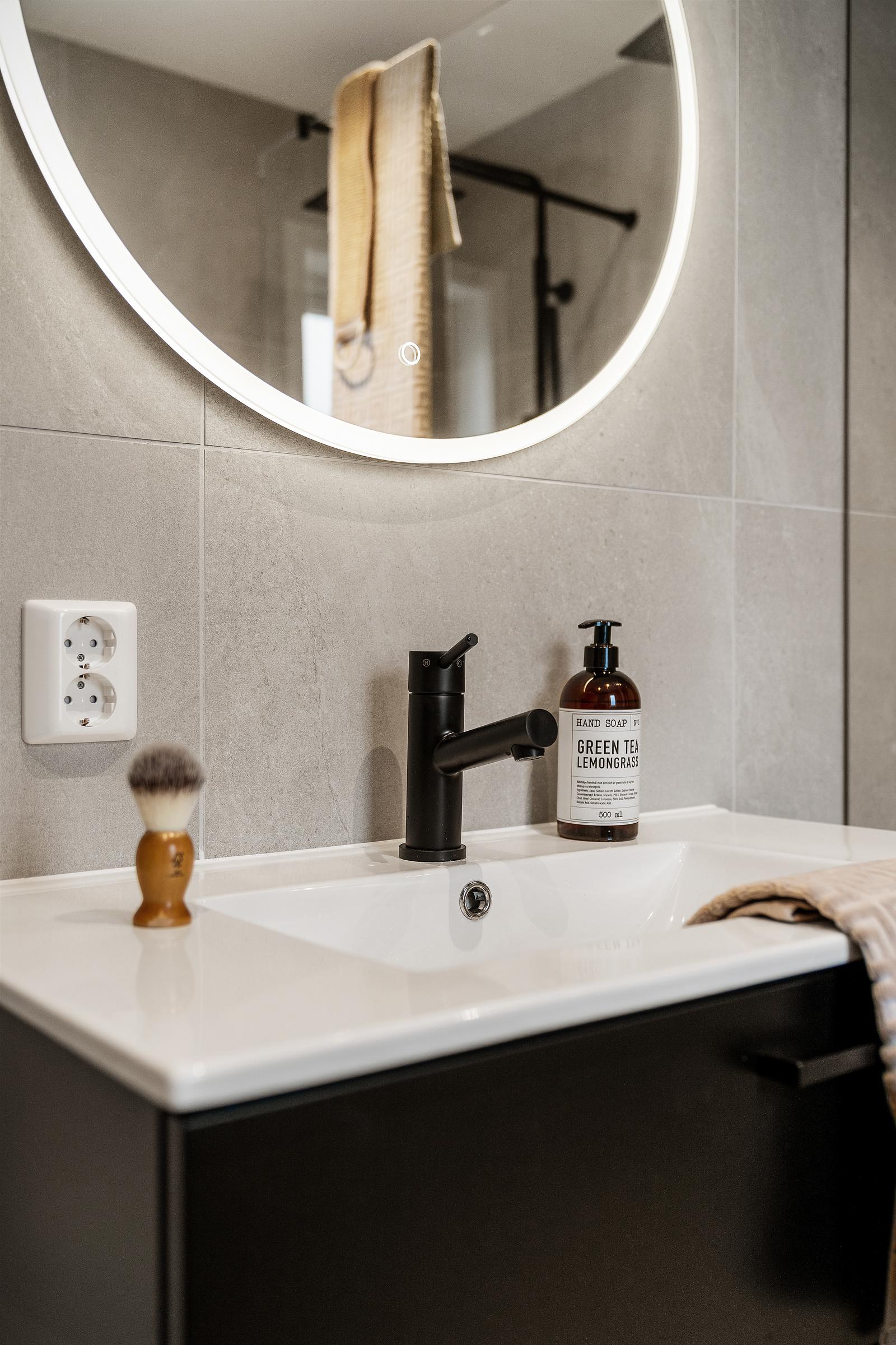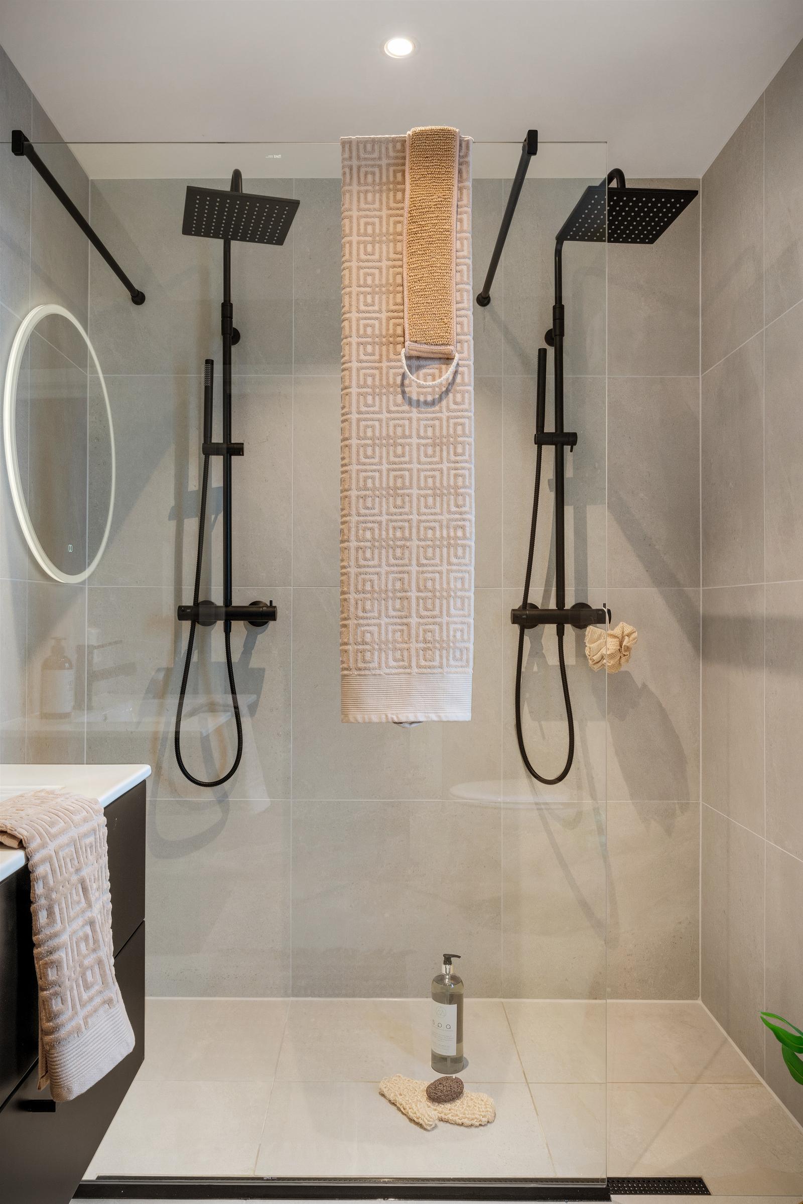 Bad hovedplan: Lekkert hovedbad med 60x60 fliser i moderne lys farge lik som entreen. Dobbel regndusj med stor glassvegg og moderne baderomsmøbler fra Hafa med rundt lysspeil.