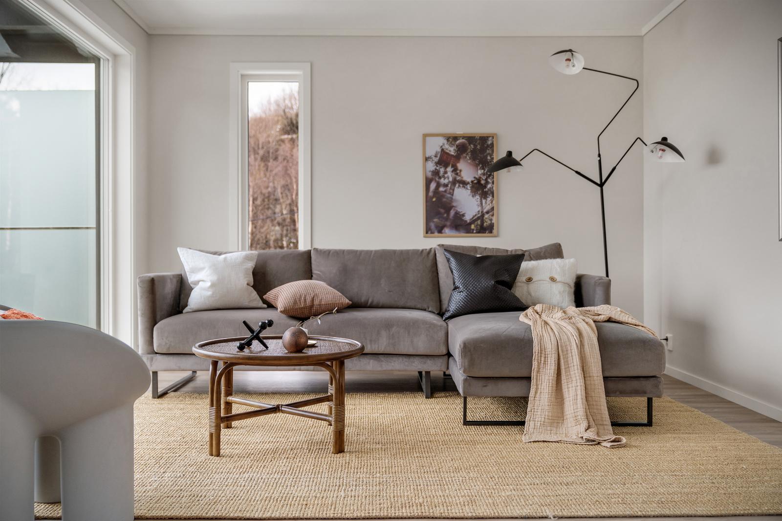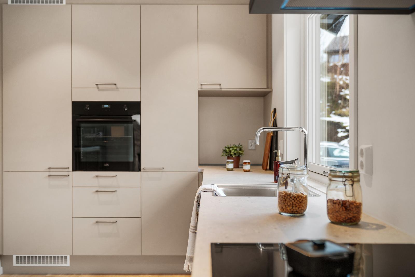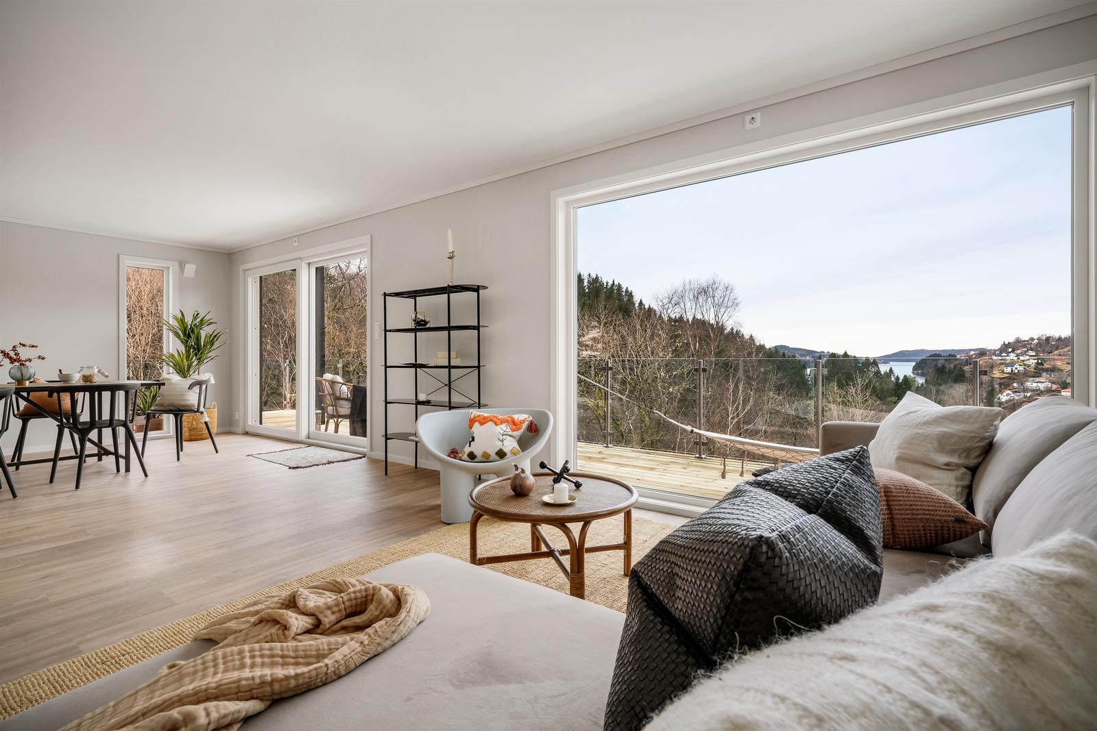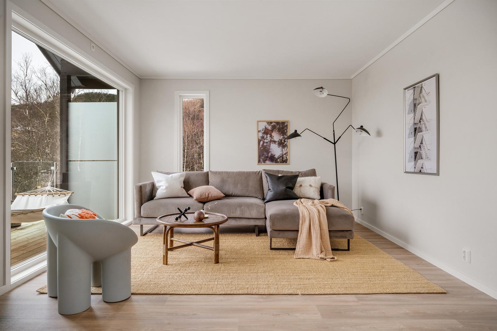 Stue/kjøkken: Stue og kjøkken har gipsede vegger som er malt i fargen kokos fra Jotun - en nydelig dempet, lys beigetone. Gulvet er klikkvinyl fra Berry Alloc i typen Pure Oak Natural. Dette gir et mykt og moderne uttrykk i stue/kjøkkendelen. Stuen har store vinduer mot nordvest, og terrassedør ut til balkong meg glassrekkverk for optimal utsikt.