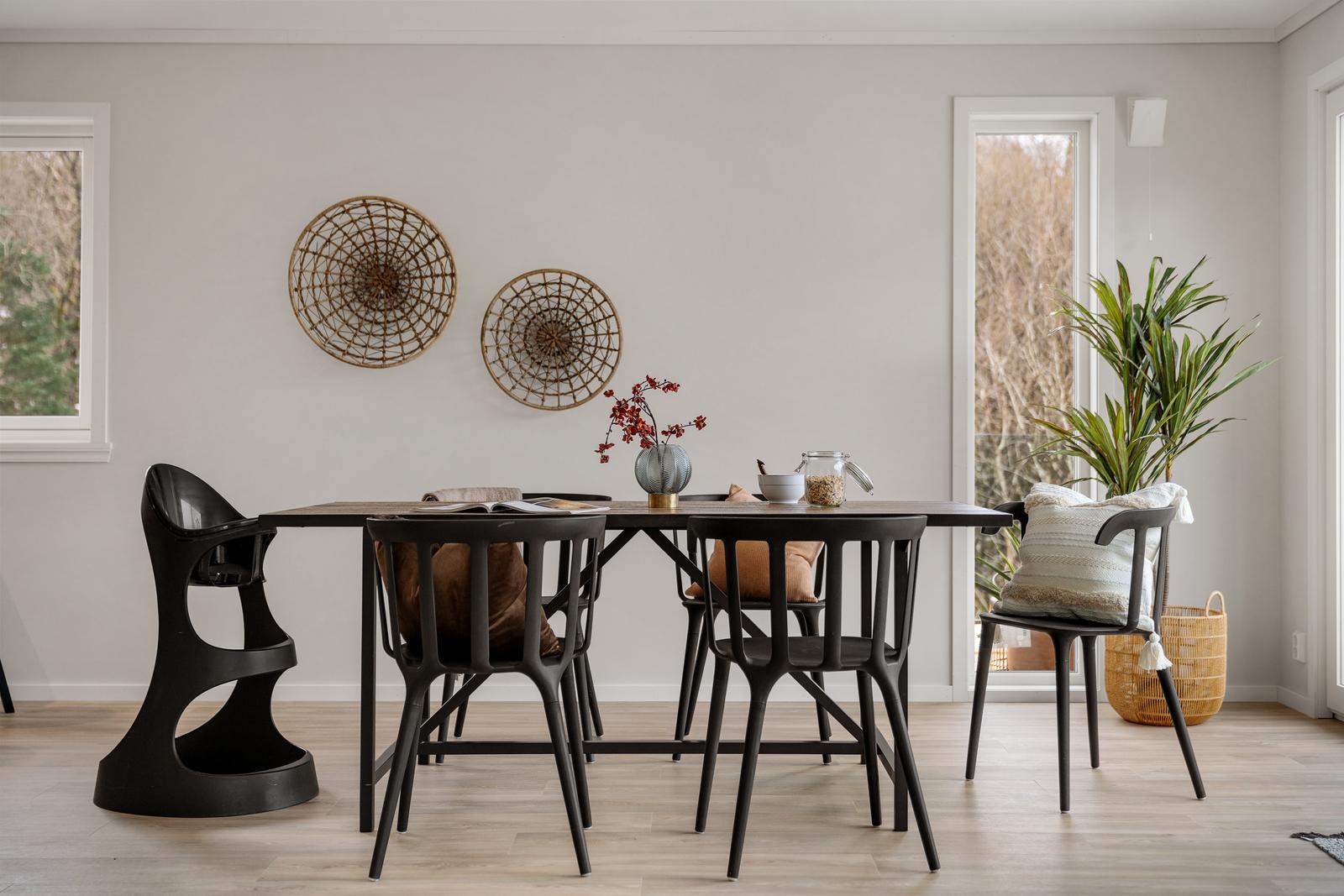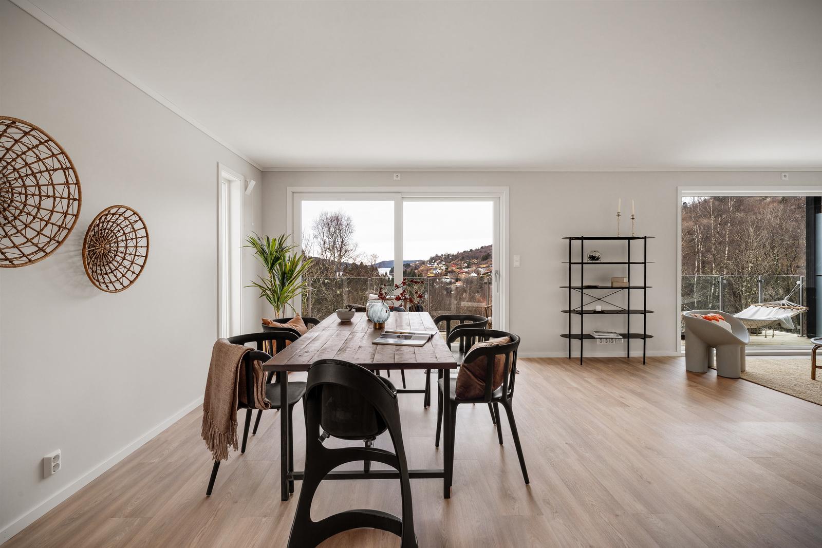 Det er god plass i stue til spise- og sofaguppe som bildene viser!