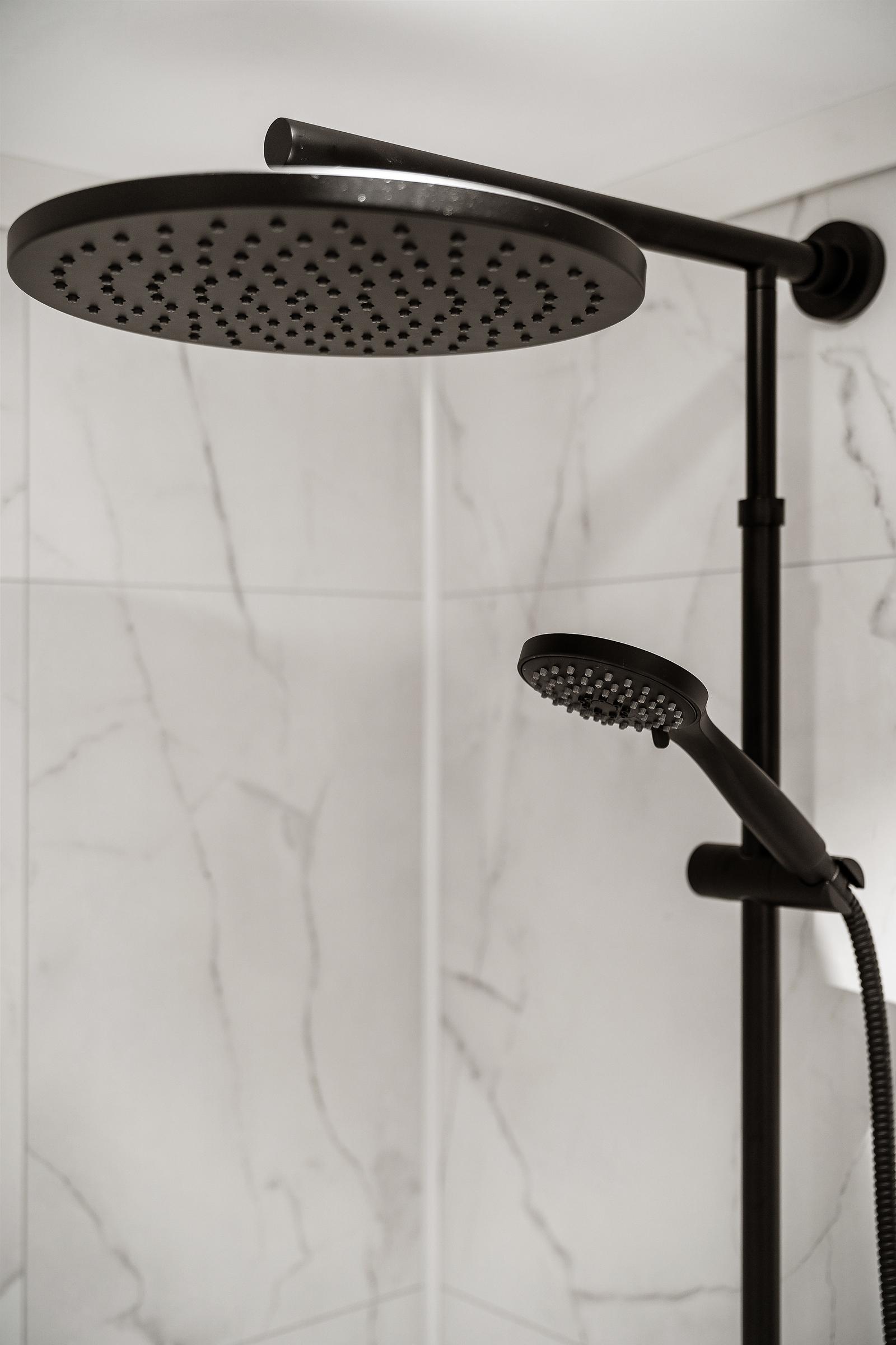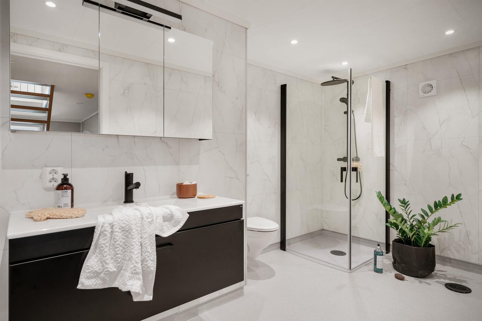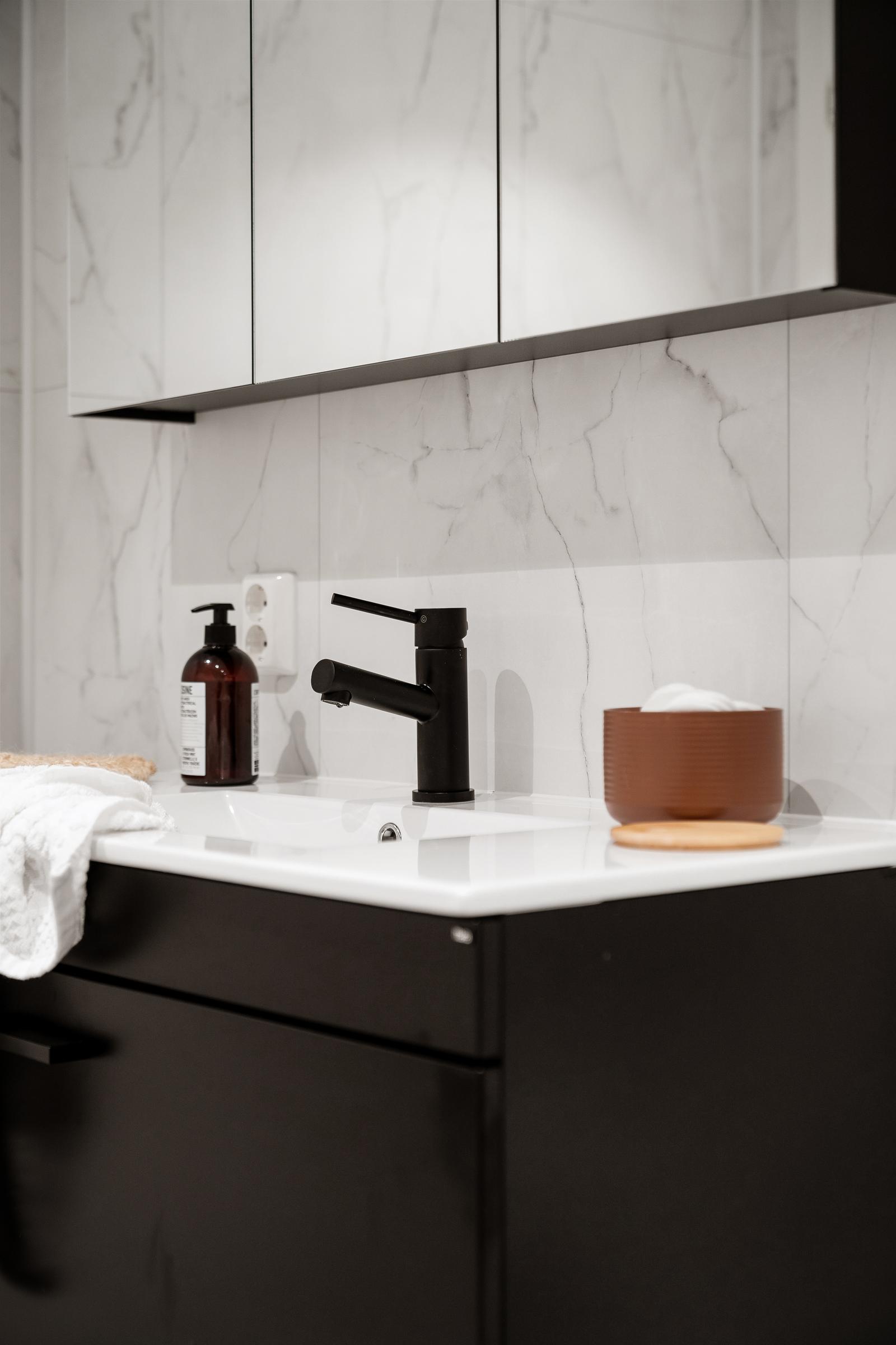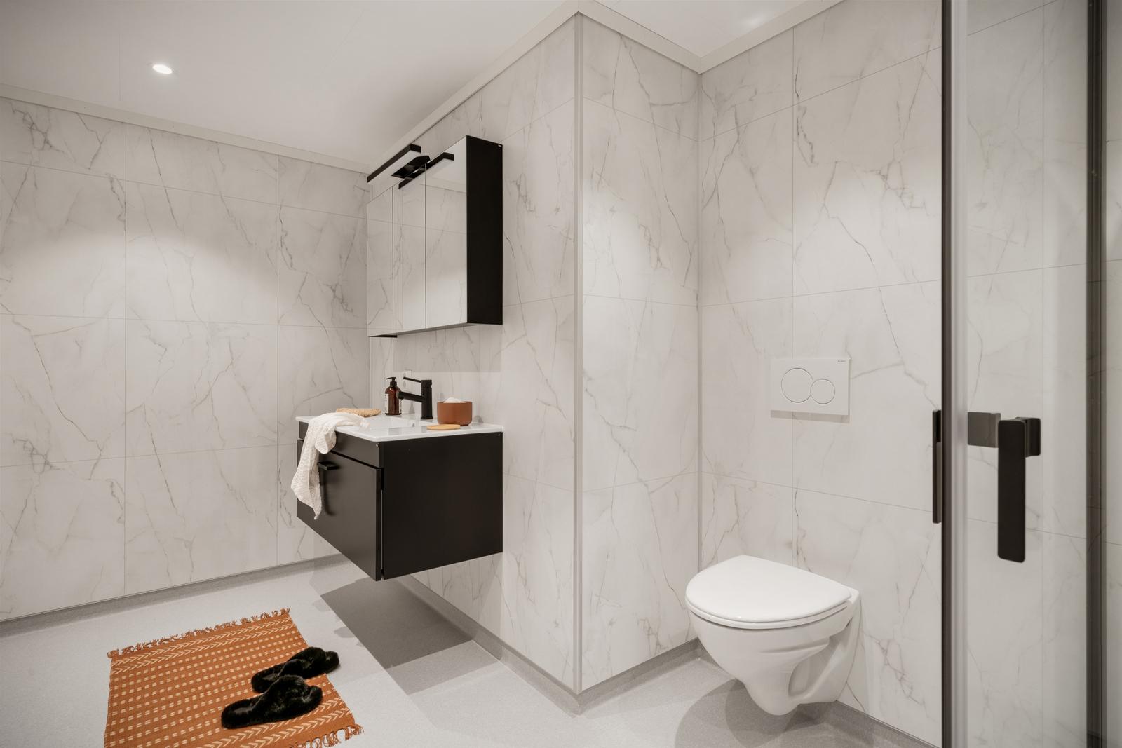 Bad nede: Dette er et sort bad på 8 m2. Her har vi valgt lyse baderomsplater med marmormønster som passer perfekt til de sorte detaljene på kraner, møbler og dusjhjørnet.