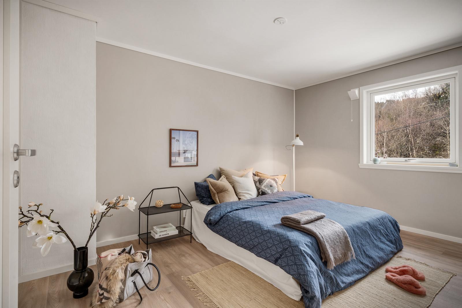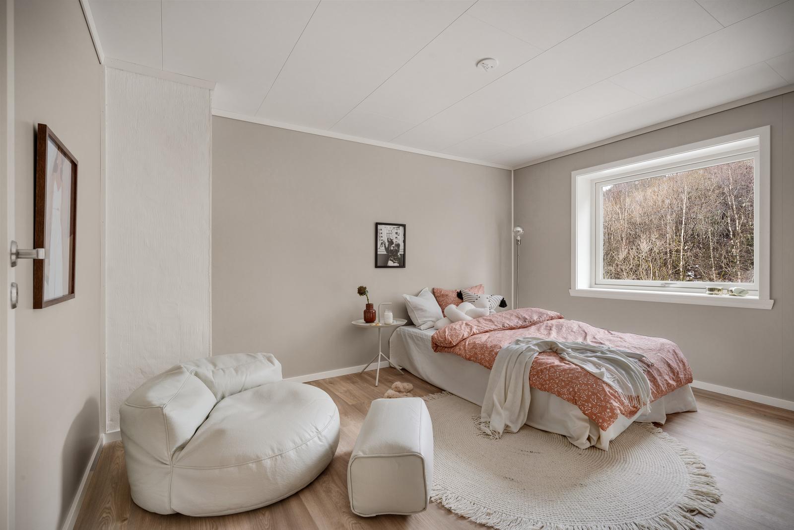 Hovedsoverom er på 12 m2, og god plass til dobbeltseng som bildene viser.