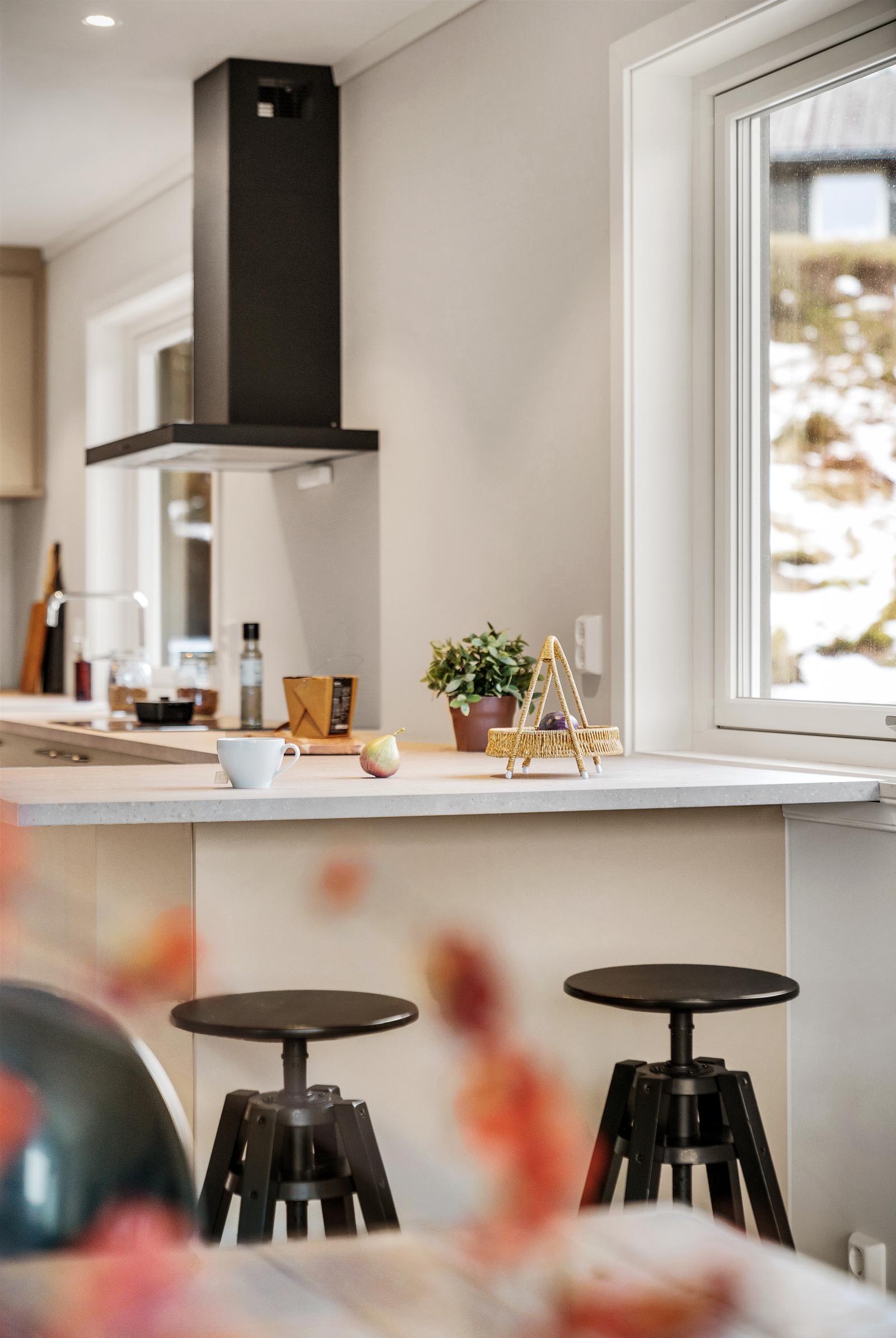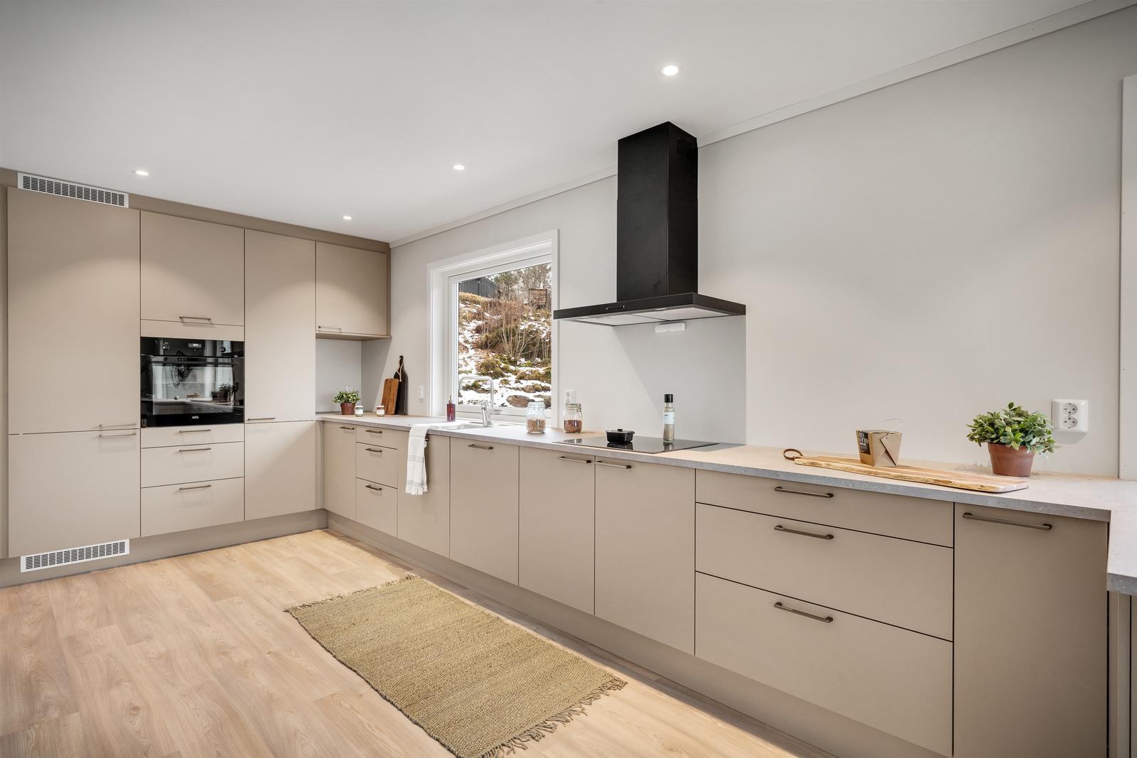 Kjøkkenet er i god kvalitet i typen Stockholm fra HTH. Kjøkkenet har godt med benkeplass i tillegg til at det avsluttes med en smart øy/spiseplass med blass til 3- 4 barkrakker