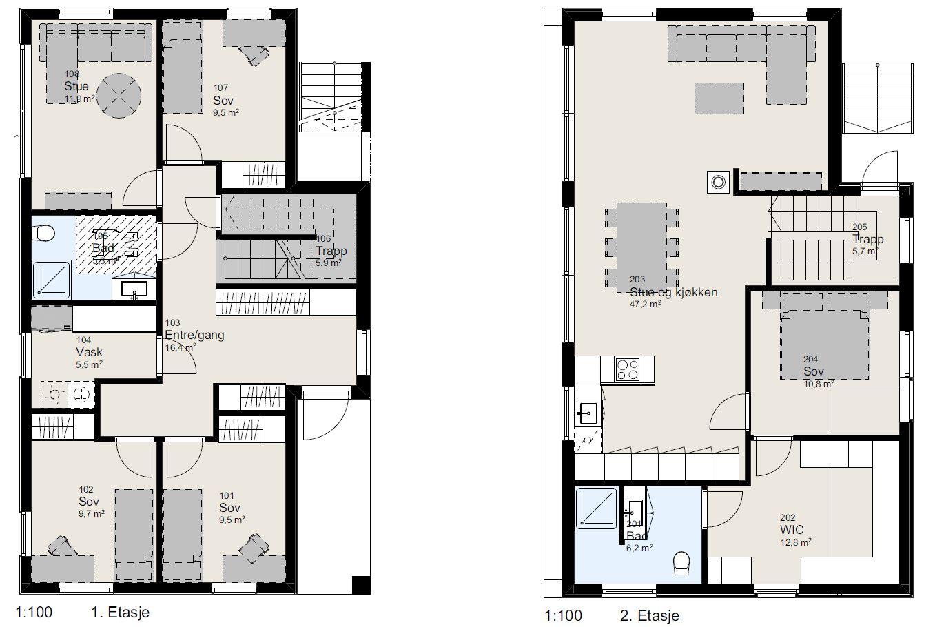 2.etasje: Stue, kjøkken, hovedsoverom med eget walk-in-closet og bad.