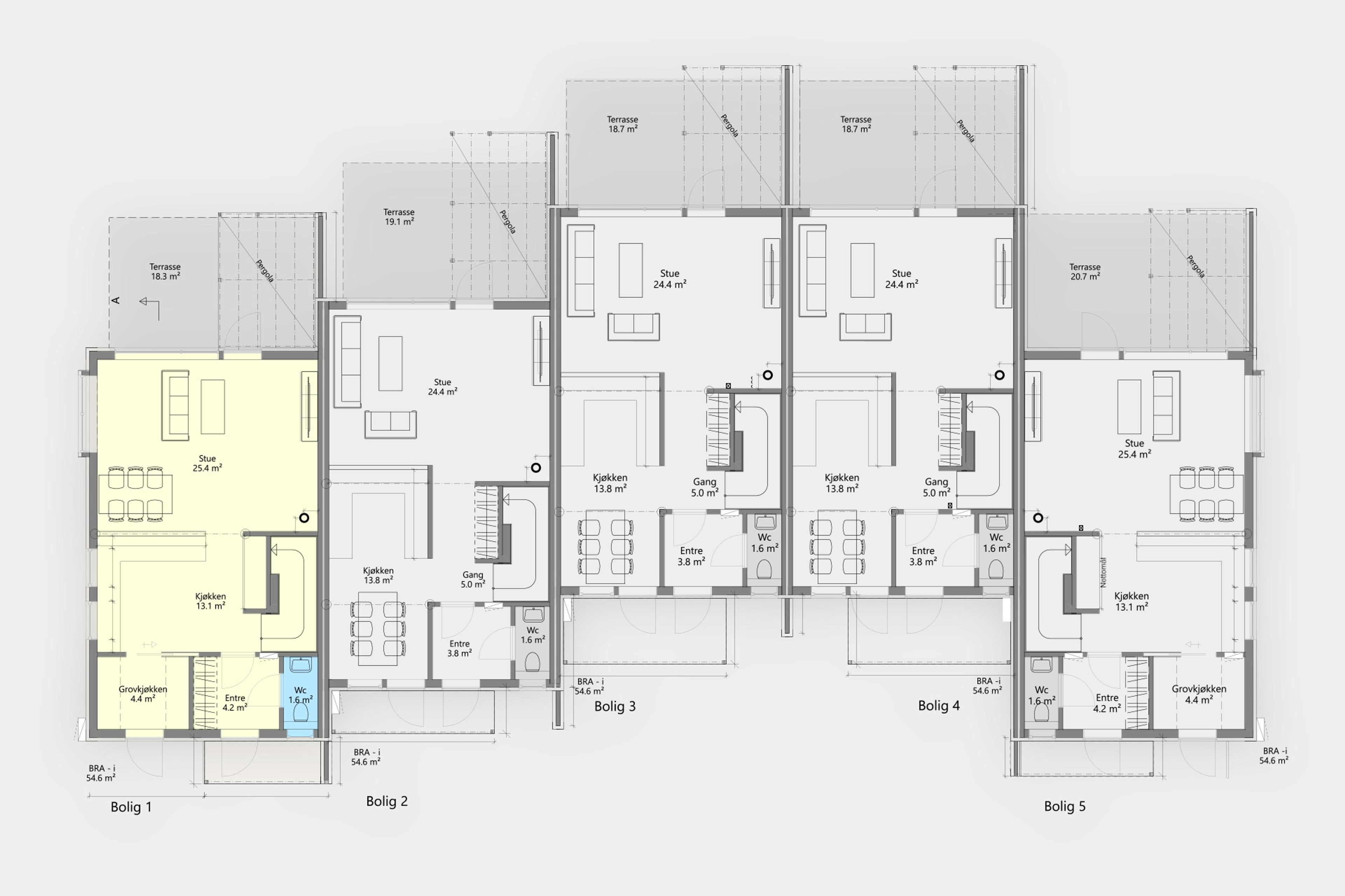 Bolig 1 har inngang via grovkjøkken/bi-inngang – en løsning som gir en mer skjermet og funksjonell hverdag. Her kan våte klær og sko tørke uten å fylle opp hovedinngangen, og du får både god lagringsplass og en praktisk arbeidsflate. Kjøkkenet har effektiv arbeidssone og naturlig flyt mot spiseplass og stue.