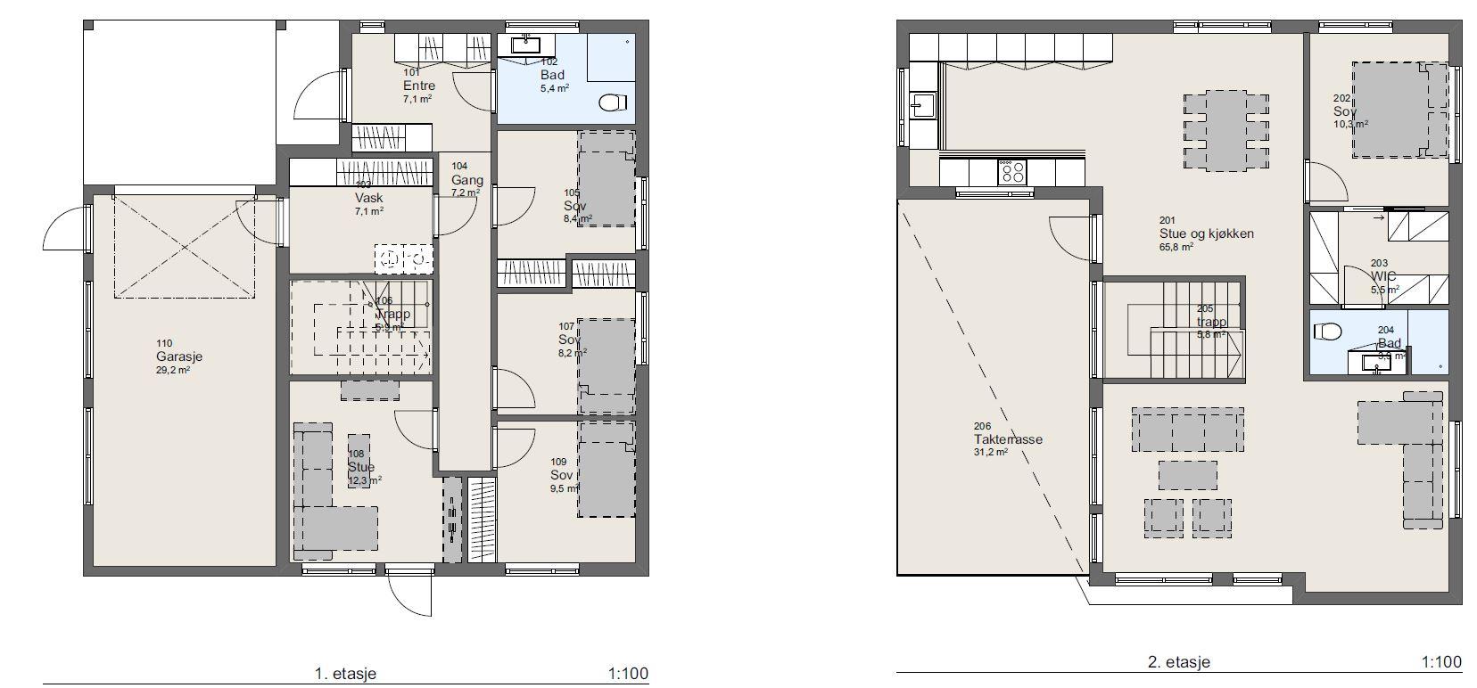2.etasje: Stue, kjøkken, hovedsoverom med eget walk-in-closet og bad, takterrasse over garasje.